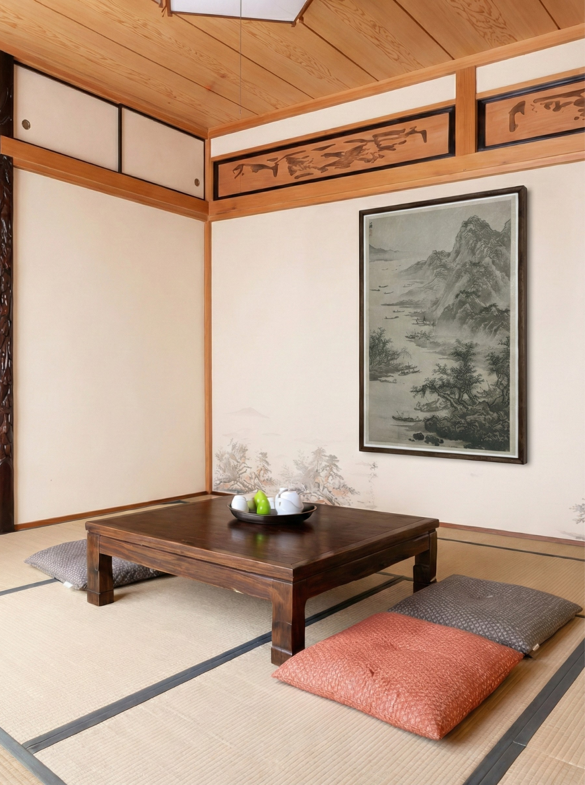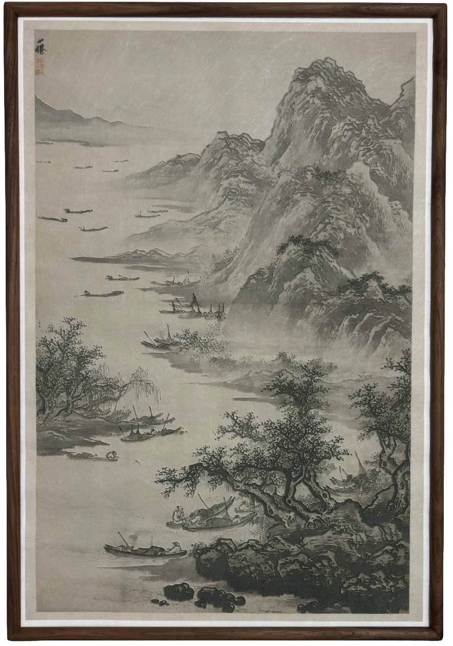 Classic ink wash landscapes and bamboo art, rendered in micro-relief on silk and framed in black walnut.