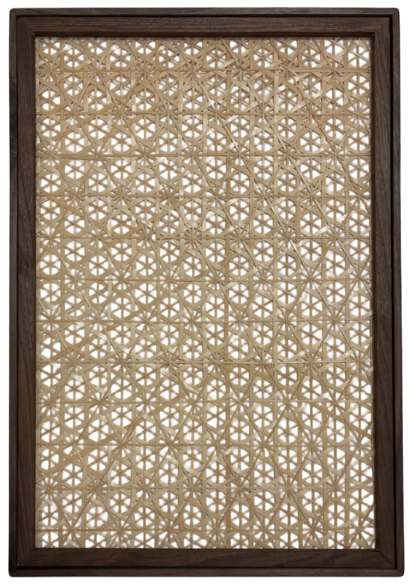 Framed in North American Black Walnut using traditional mortise-and-tenon joinery. The frame encases a hand-woven bamboo back panel, with all connections secured by walnut pegs